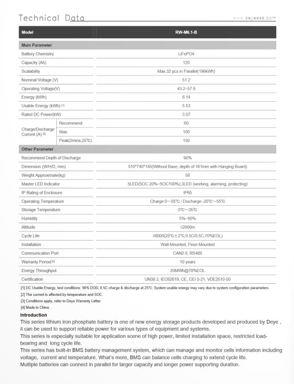 • Deye RW-M 6.1-B je najmodernija litij-željezno-fosfatna (LFP) baterija, namijenjena osiguranju pouzdanih, sigurnih i visoko učinkovitih rješenja pohrane energije za stambene i komercijalne primjene. Sa svojim naprednim sustavom upravljanja baterijom (BMS) i modularnom konstrukcijom, ova baterija osigurava dug životni vijek, visoku gustoću energije i potpunu zaštitu za vaše potrebe pohrane energije.